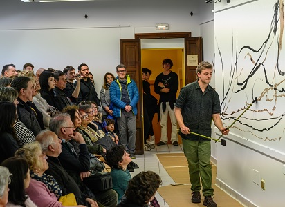 Miquel Veny abans de començar va explicar al nombres públic assistent, que l’acte consistiría en generar una partitura gràfica en directe que funcionava com un diàleg entre el so i la línia.