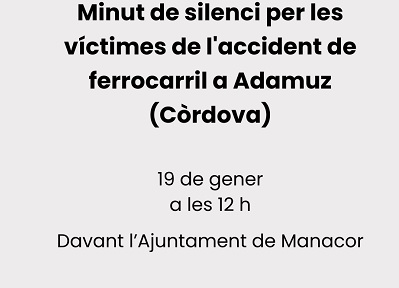 El Ayuntamiento de Manacor convoca un minuto de silencio a las 12:00 horas por las víctimas del accidente de tren en Adamuz, Córdoba. L'Ajuntament de Manacor convoca un minut de silenci a les 12 h per les víctimes de l'accident de tren a Adamuz, Còrdova.