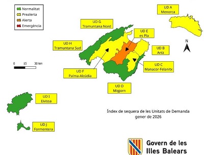 En cuanto a las unidades de demanda (UD), ocho muestran incrementos: Menorca, Artà, Manacor-Felanitx, Palma-Alcúdia, Tramuntana Nord, Tramuntana Sud, Eivissa y Formentera, mientras que la UD Migjorn se mantiene estable. Los ascensos más significativos corresponden a las UD Tramuntana Sud, Tramuntana Nord y Eivissa, que entran en situación de normalidad, y a la UD Artà, que pasa a prealerta. Actualmente, el 44,2 % del territorio (Formentera, Migjorn, Tramuntana Nord, Tramuntana Sud y Eivissa) se encuentra en situación de normalidad; el 45,6 % (Menorca, Artà, Manacor-Felanitx y Palma-Alcúdia) está en prealerta; y el 10,2 % (Es Pla) continúa en alerta. Cabe destacar que la UD Eivissa no se encontraba en situación de normalidad desde diciembre de 2022.